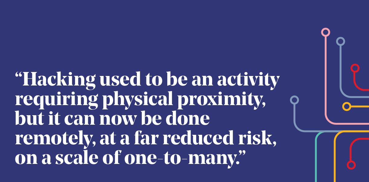 Worse still, the rise in wireless connectivity massively increases the vulnerability of devices. Hacking used to be an activity requiring physical proximity, but it can now be done remotely, at a far reduced risk, on a scale of one-to-many.