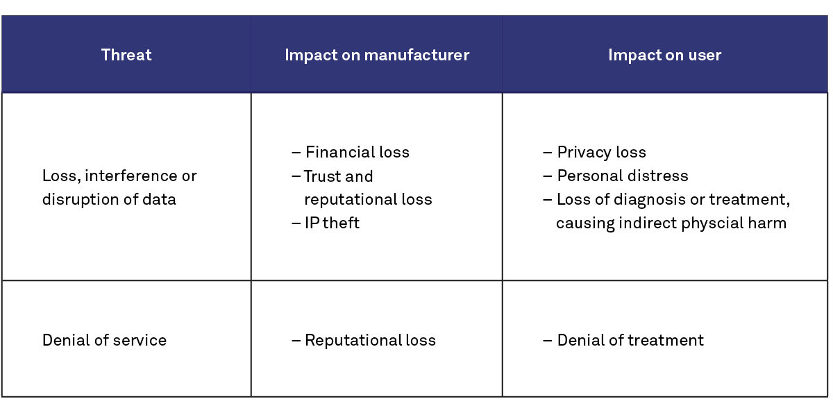 The worst-case scenario of a cybersecurity breach is physical harm to the end user or patient. Aside from patient wellbeing, a breach can have dire commercial consequences for a manufacturer, and consequences of trust and reputation for stakeholders such as doctors, medical bodies, or institutions. Increasingly, as regulations are introduced and mature, and end customer awareness improves, manufacturers or organisations without rigorous cybersecurity measures could find themselves excluded from key regions and markets.