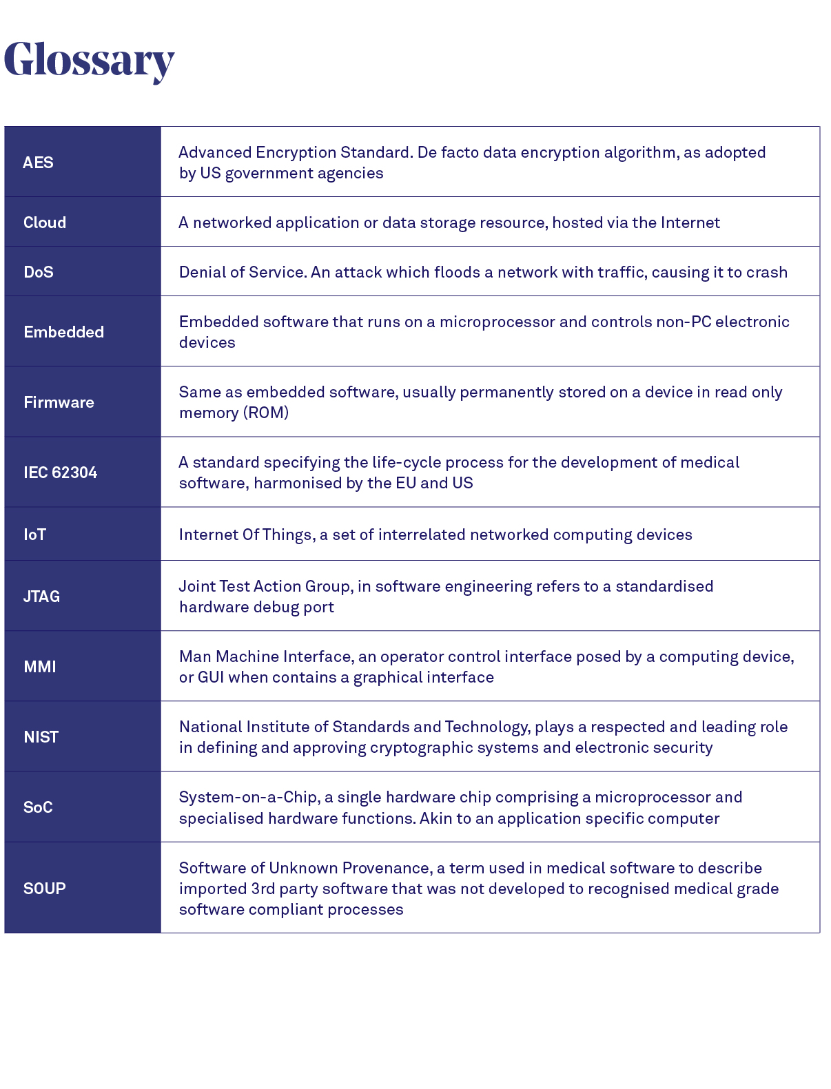 A medical device will contain application specific executable code, which performs the device functions in close harmony with the electronics design. Its integrity is fundamental to the behaviour, safety, and security of the device. The executable code and datasets are permanently emplaced in the device build, and this is known as the ‘firmware’.