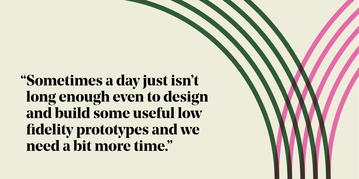 We’ve realised that if you want to create the sorts of physical prototypes we need to test with users, then you need at least a 2 week sprint. The first week to do the creative part of the sprint process and the second week to create, fettle, build the prototypes and test them. What’s important though is that you don’t use it as an excuse to drag out the process and lose the benefit of rapid-fire development – so our advice is that you only build in the extra time that you REALLY need.