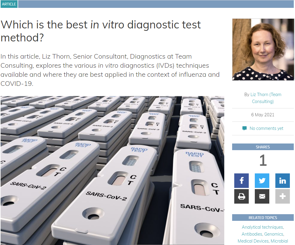 Over the past year, the volume of in vitro diagnostic (IVD) tests being used to detect COVID-19 has reached a scale never before seen. In a new article for the European Pharmaceutical Review, Liz Thorn, Senior Diagnostics Consultant, looks at the pros and cons of different IVD test methods.